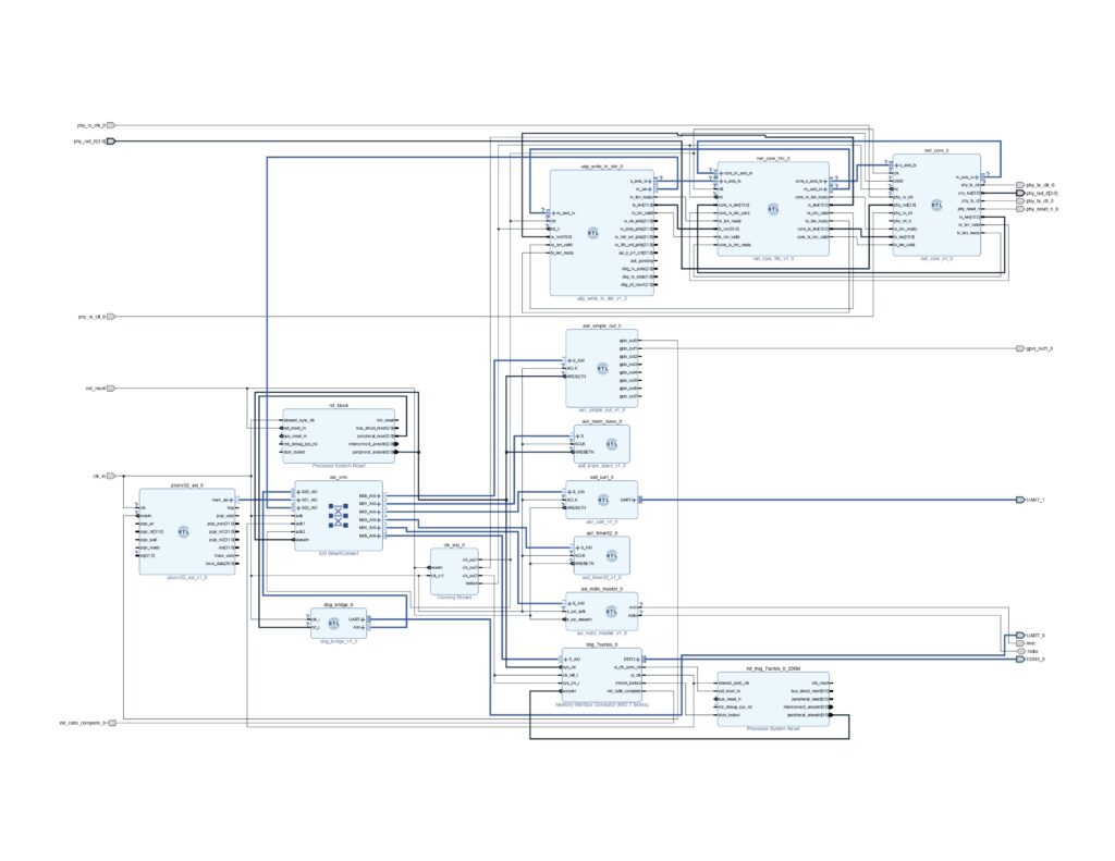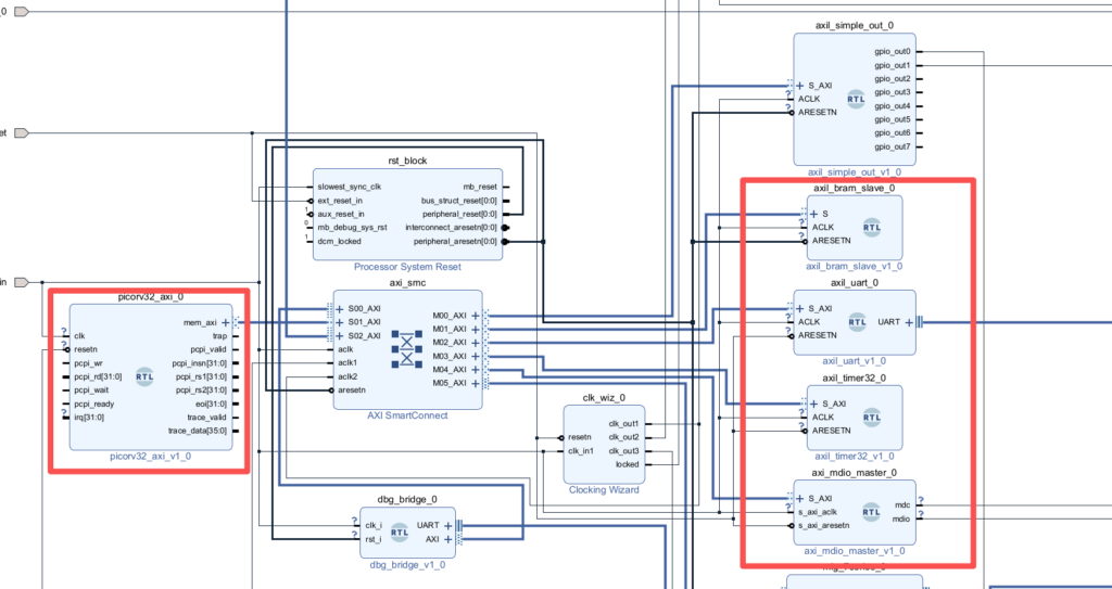 其中BRAM是程序储存和运行内存,UART就是打印日志,定时器提供毫秒时间,MDIO就是网卡控制不用多解释.