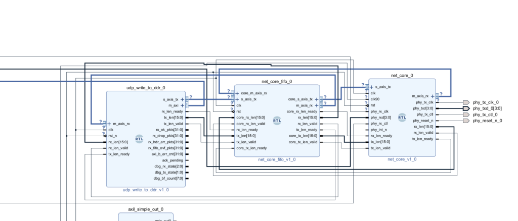网络这里,netcore是对接verilog-ethernet,中间插入fifo是为了不背压以太网,以及过滤坏包.udp_write_to_ddr是具体协议实现.协议在收包后ACK,COMMIT到DDR后再ACK.